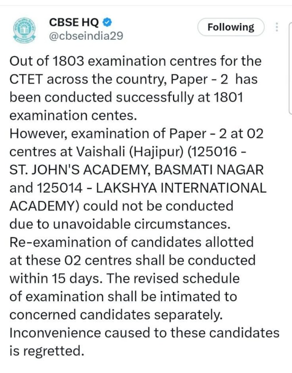 CBSE ने प्रभावित छात्रों को हुई असुविधा पर खेद जताया है और कहा है कि परीक्षा को जल्द दोबारा आयोजित किया जाएगा। बोर्ड की तरफ से यह भी बताया गया कि सभी छात्रों को परीक्षा देने का पूरा अवसर मिलेगा और पूरी प्रक्रिया को तय नियमों के अनुसार पूरा किया जाएगा।
