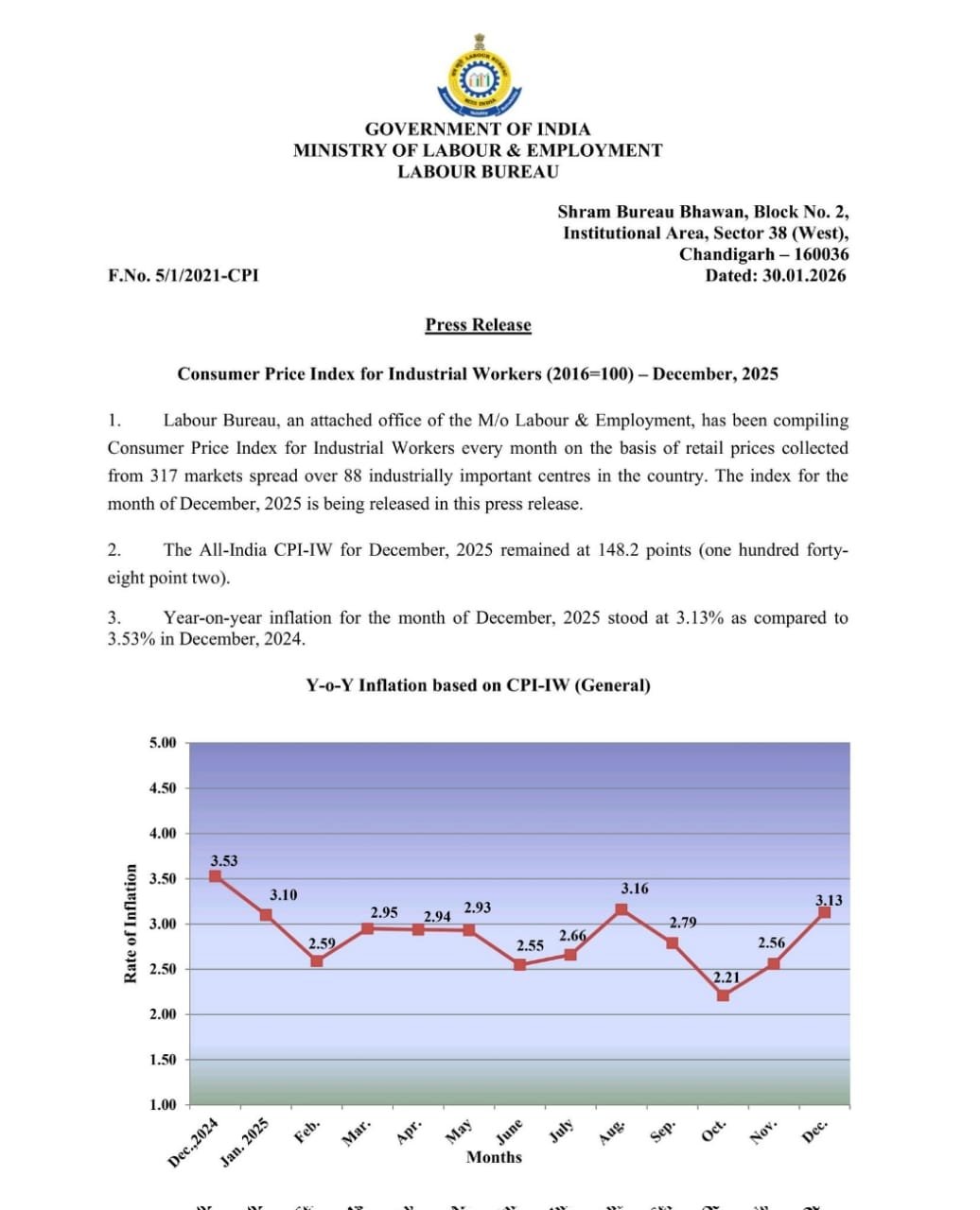 श्रम एवं रोजगार मंत्रालय के अंतर्गत श्रम ब्यूरो ने दिसंबर 2025 के लिए ऑल इंडिया CPI-IW के आंकड़े जारी किए हैं। इसके अनुसार दिसंबर 2025 में CPI-IW 148.2 अंक पर दर्ज किया गया है। यह सूचकांक 2016 को आधार वर्ष मानकर तैयार किया जाता है और देश के अलग-अलग औद्योगिक केंद्रों से खुदरा कीमतों के आधार पर हर महीने जारी किया जाता है, जिसका सीधा असर डीए की गणना पर पड़ता है।